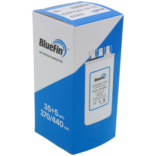 This 35/5 MFD Round Dual Motor Run Capacitor (440/370V) is manufactured by Bluefin.